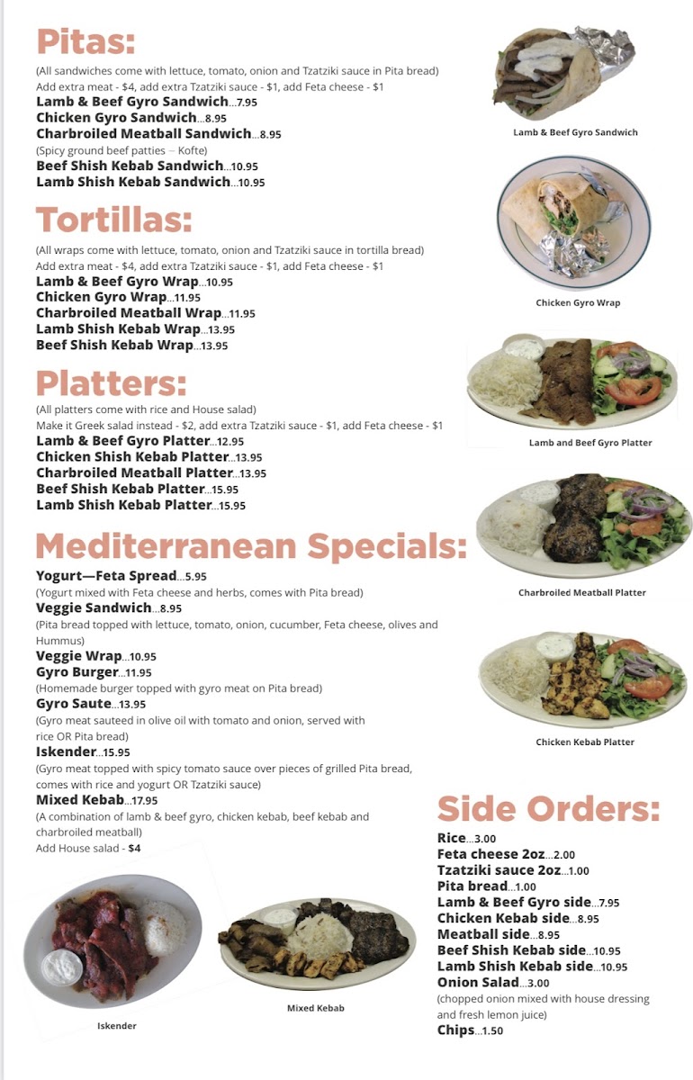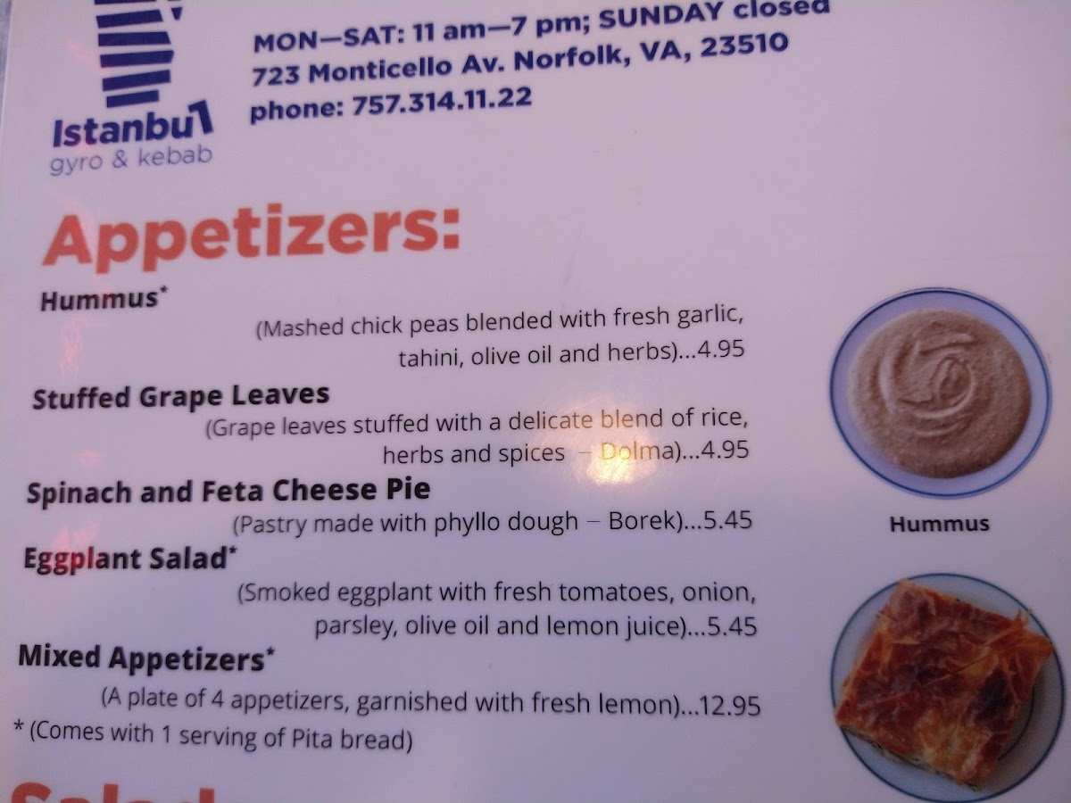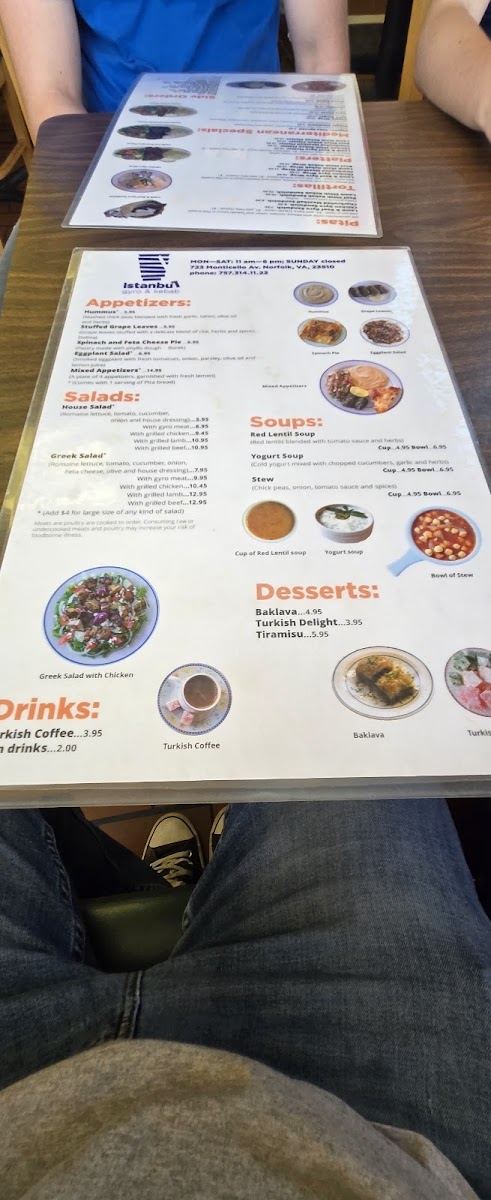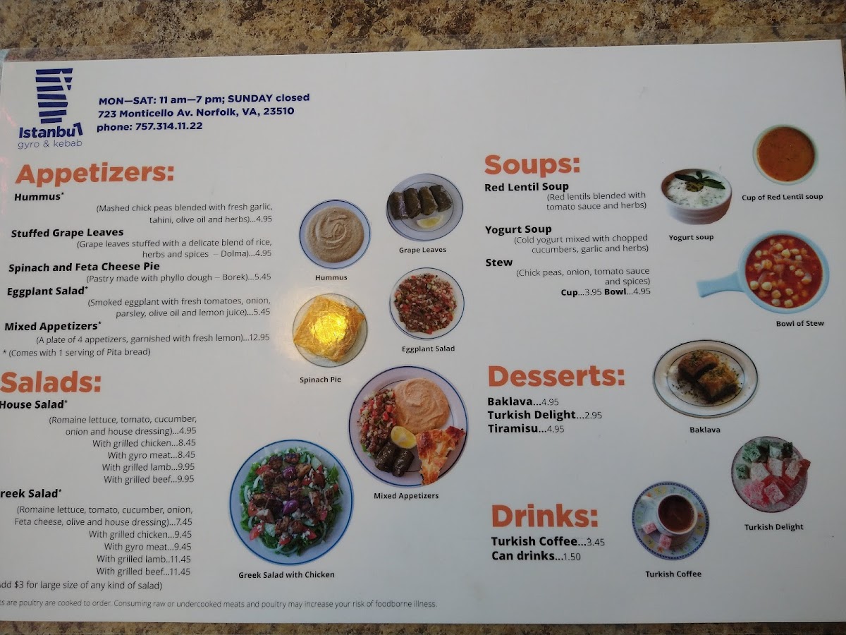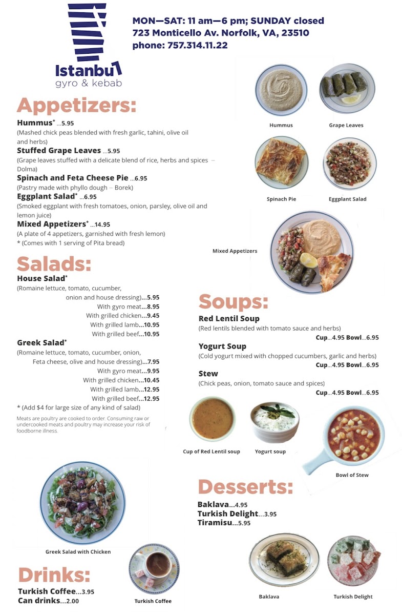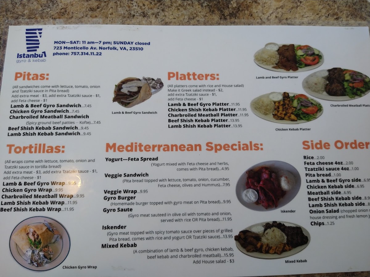 Welcome to Istanbul Gyro & Kebab, a delightful culinary gem located at 723 Monticello Ave, Norfolk, VA. This charming eatery specializes in authentic Mediterranean cuisine, offering a menu that features an array of tantalizing platters. Guests can savor the Lamb Shish Kebab Platter for $17.95 or indulge in the flavor-packed Lamb & Beef Gyro Platter for $13.95. The Chicken Shish Kebab Platter is another standout at $15.95, showcasing perfectly grilled marinated chicken that melts in your mouth.